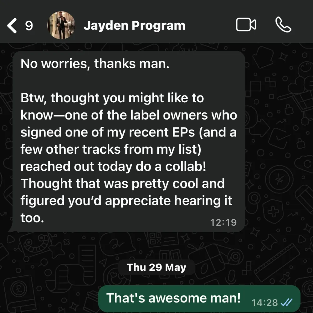 "Every track I've sent trying to get on the label has made me a better producer… I listen to my music in a different way now because of your feedback. I hit a point where I couldn’t improve any more on my own. Having you listen to my stuff each week… it just leaps you forward.”
